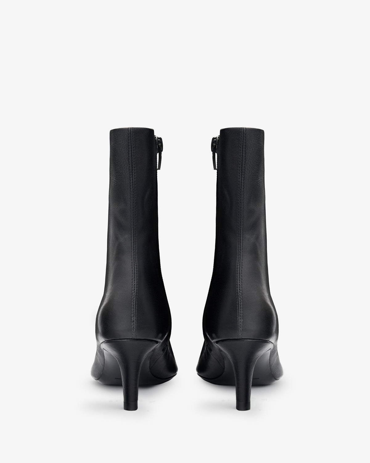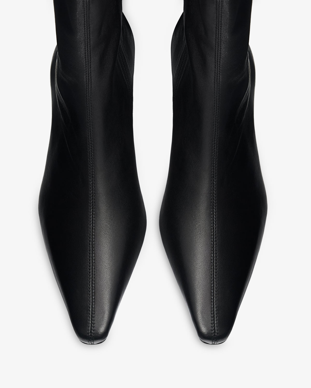 Ankle boot in stretch suede with a pointed toe and curved blade heel.