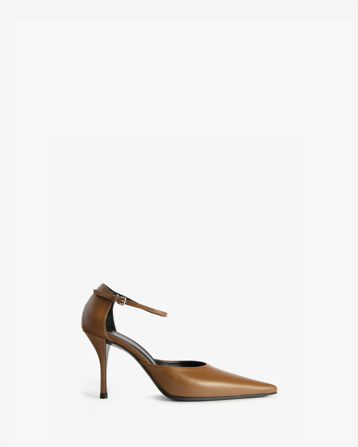 Creased leather pointed toe pump with stiletto heel and ankle strap.