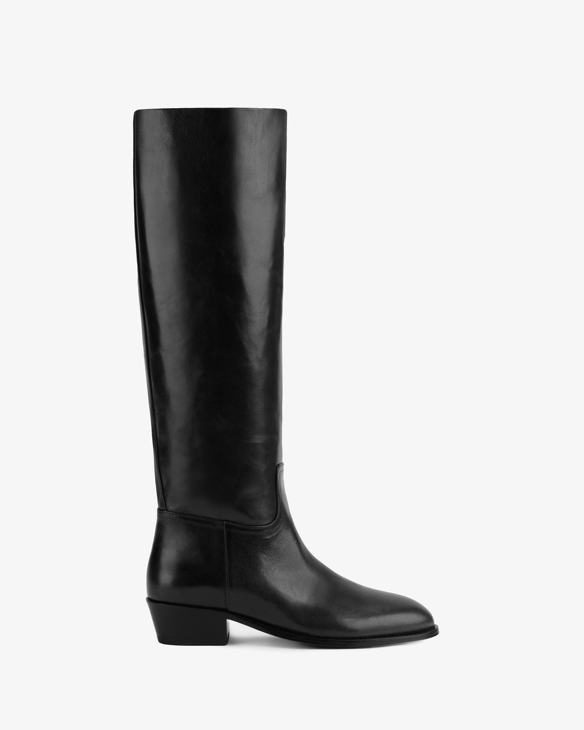 Pull on boot in polished calfskin leather with round toe and low block heel.