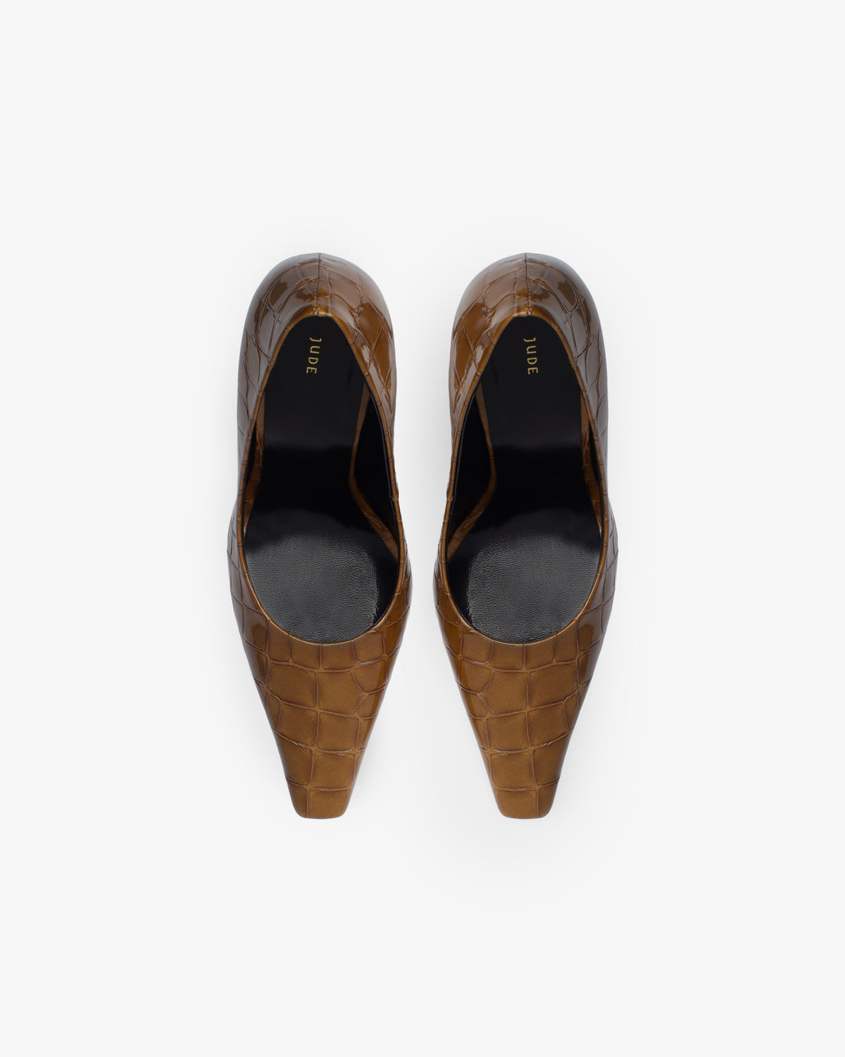 Patent Croc Embossed leather pointed toe pump with curved blade heel.