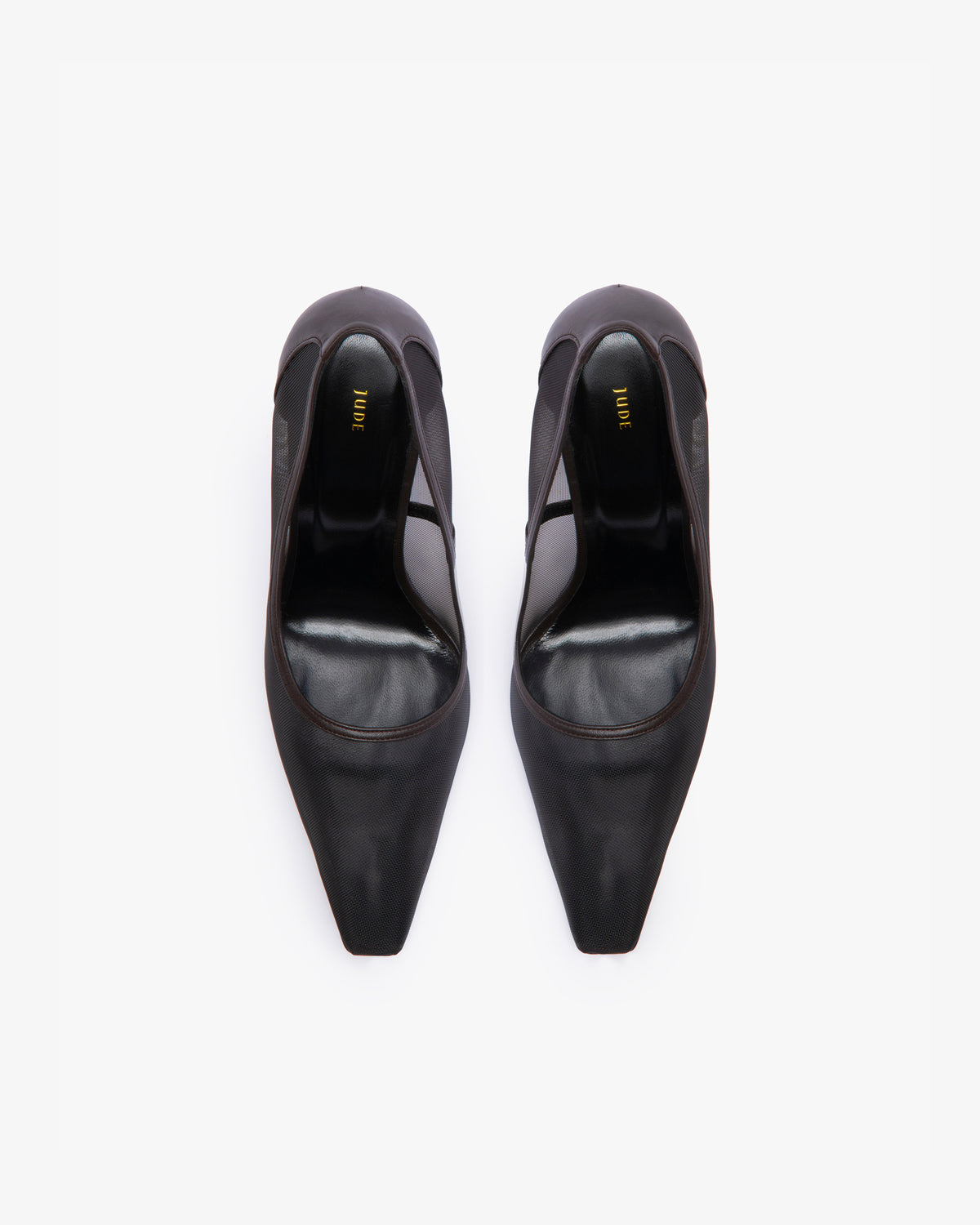 Almond toe pump with curved, dagger heel semi-sheer brown mesh.