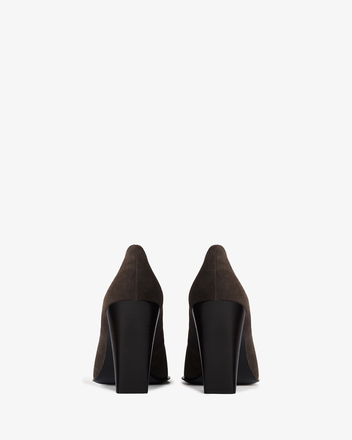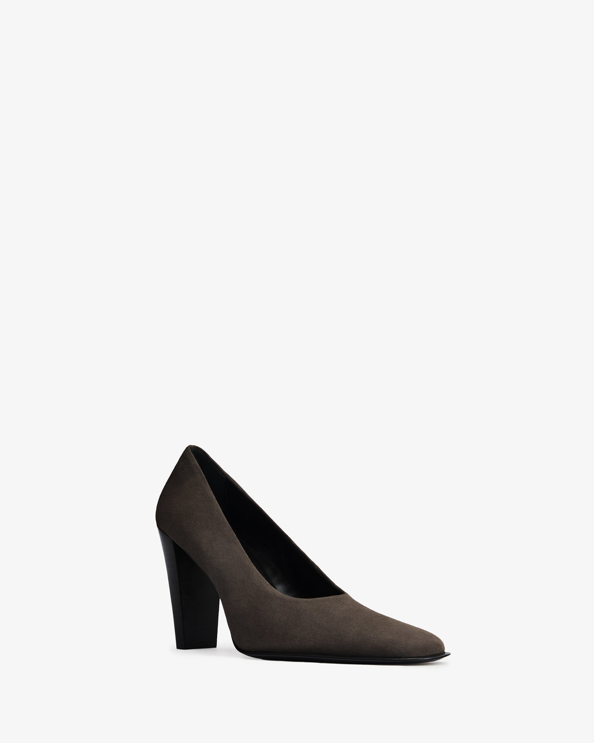 High heel pump in soft suede leather with round toe, tapered heel and leather sole.