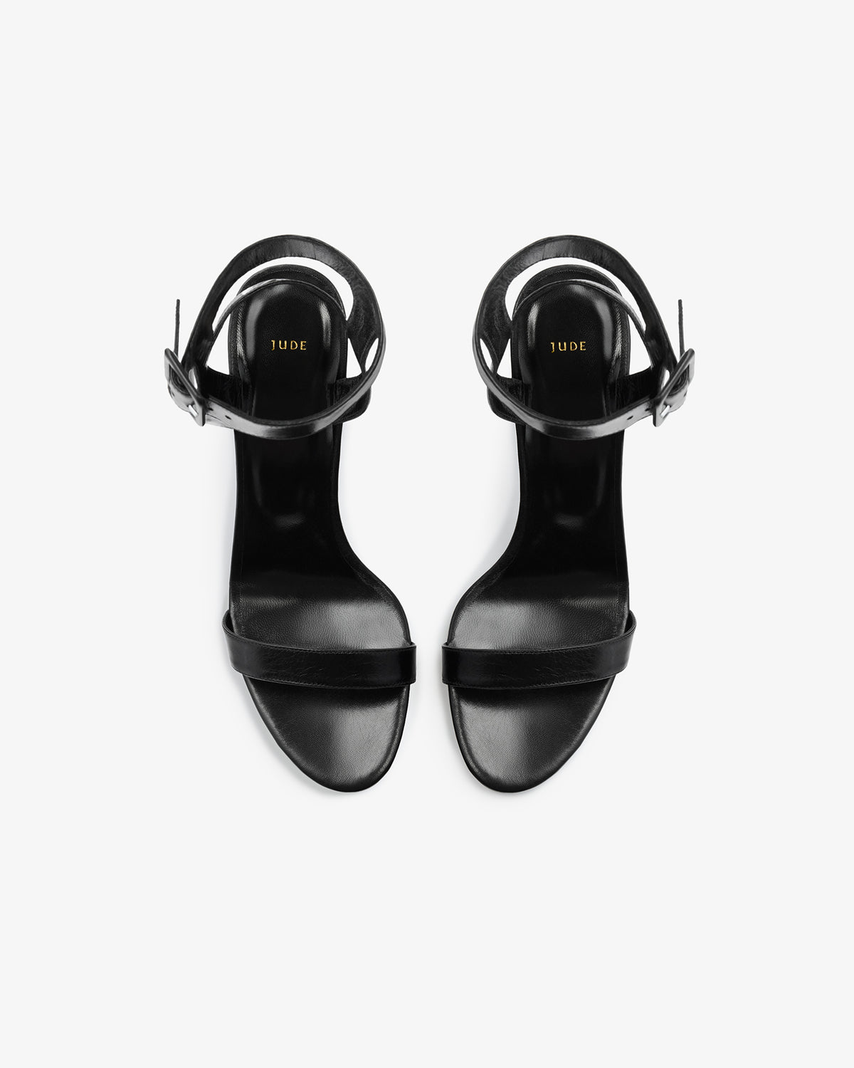 Heeled sandal in creased lambskin leather with buckled ankle straps and tapered heel.