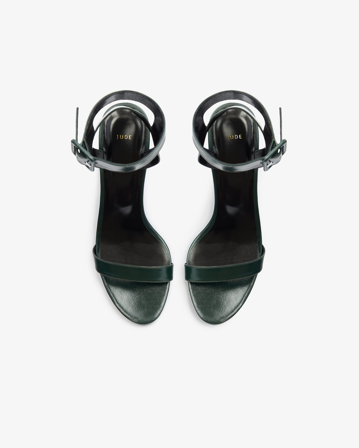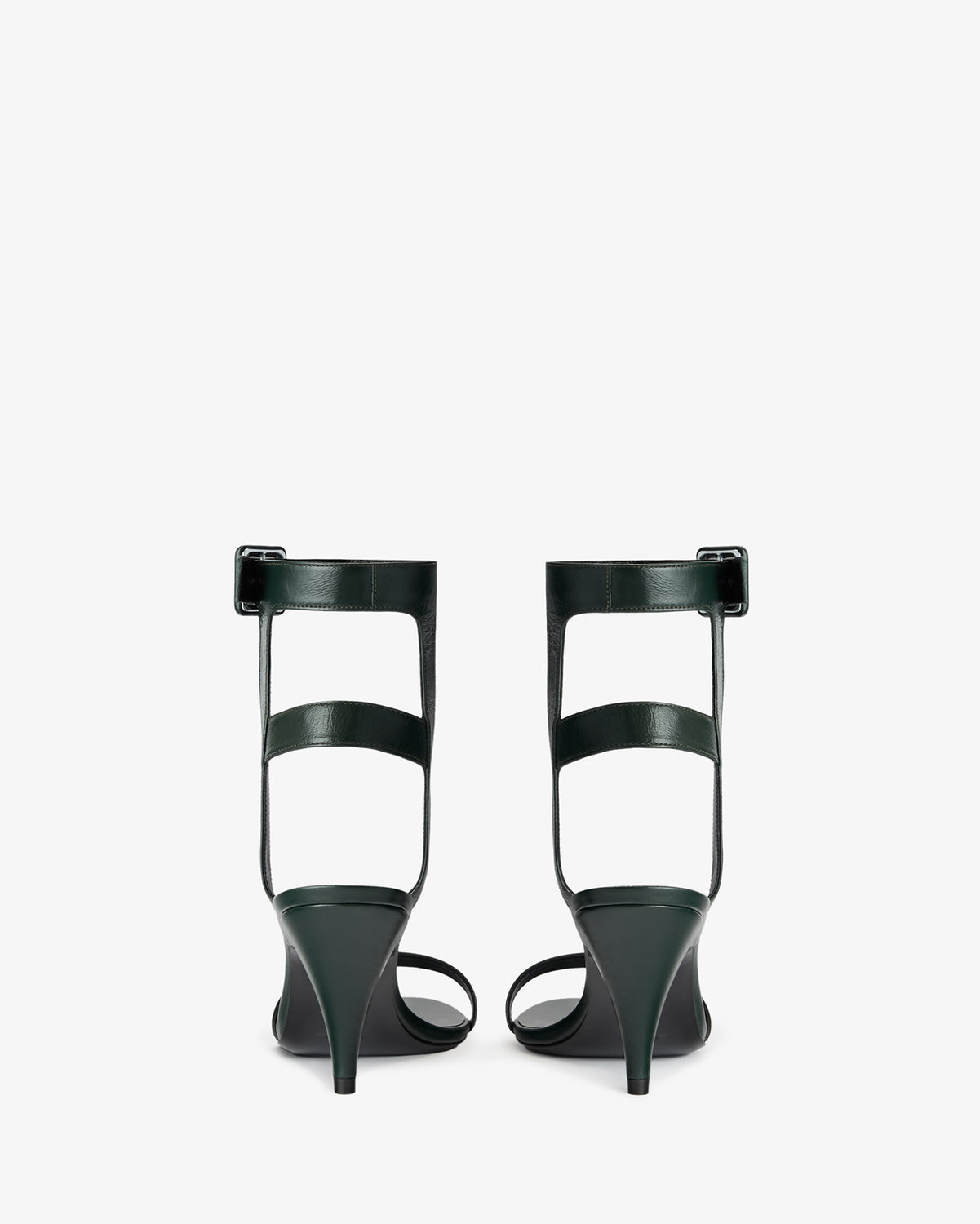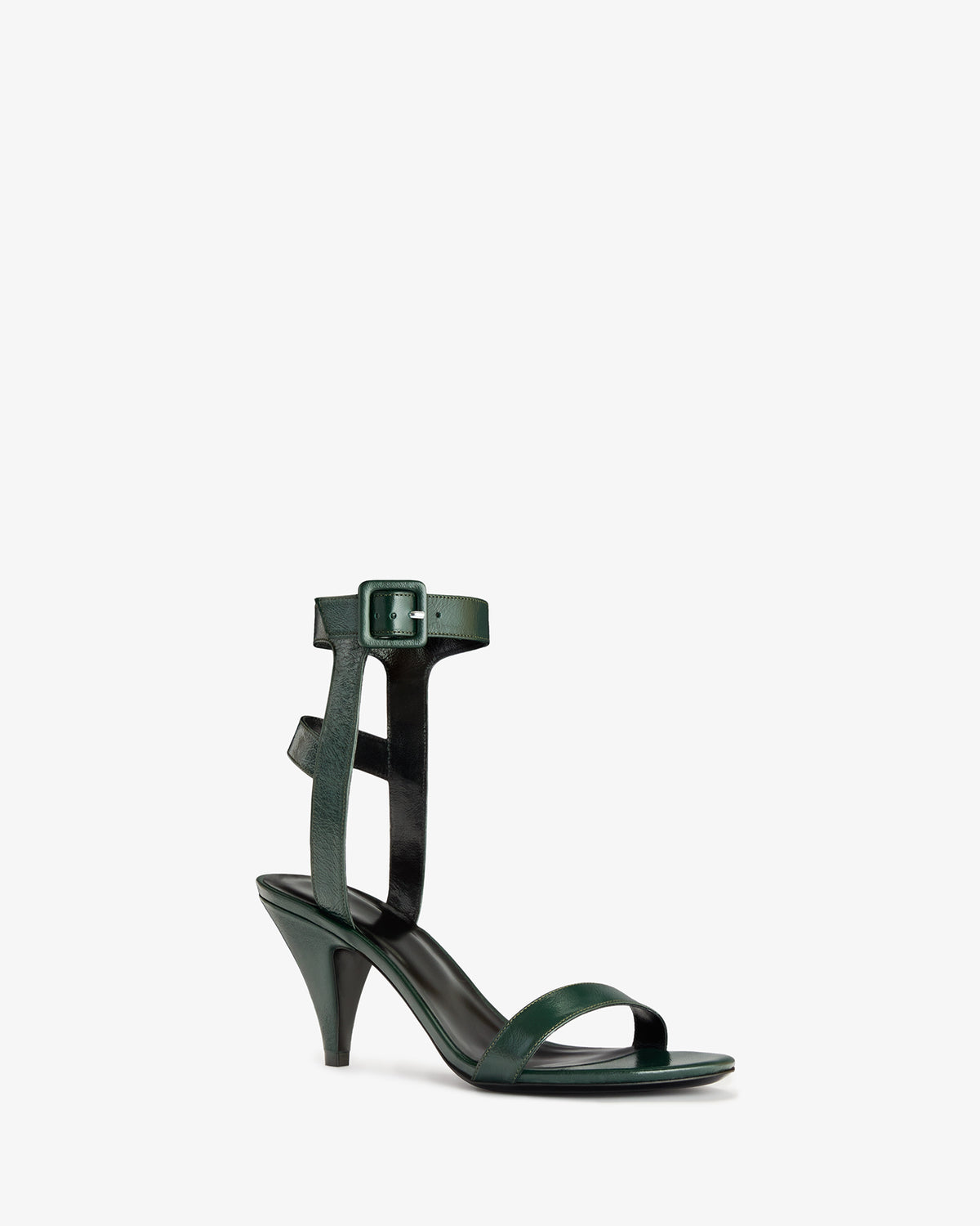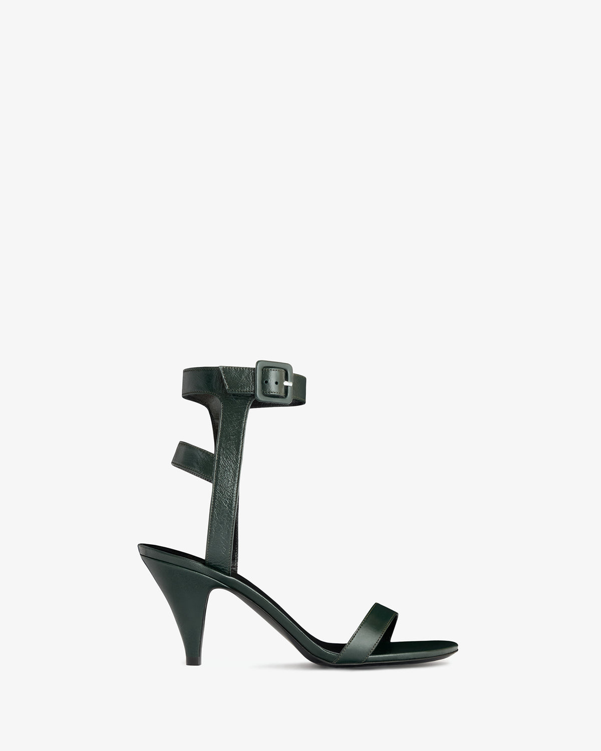 Heeled sandal in creased lambskin leather with buckled ankle straps and tapered heel.