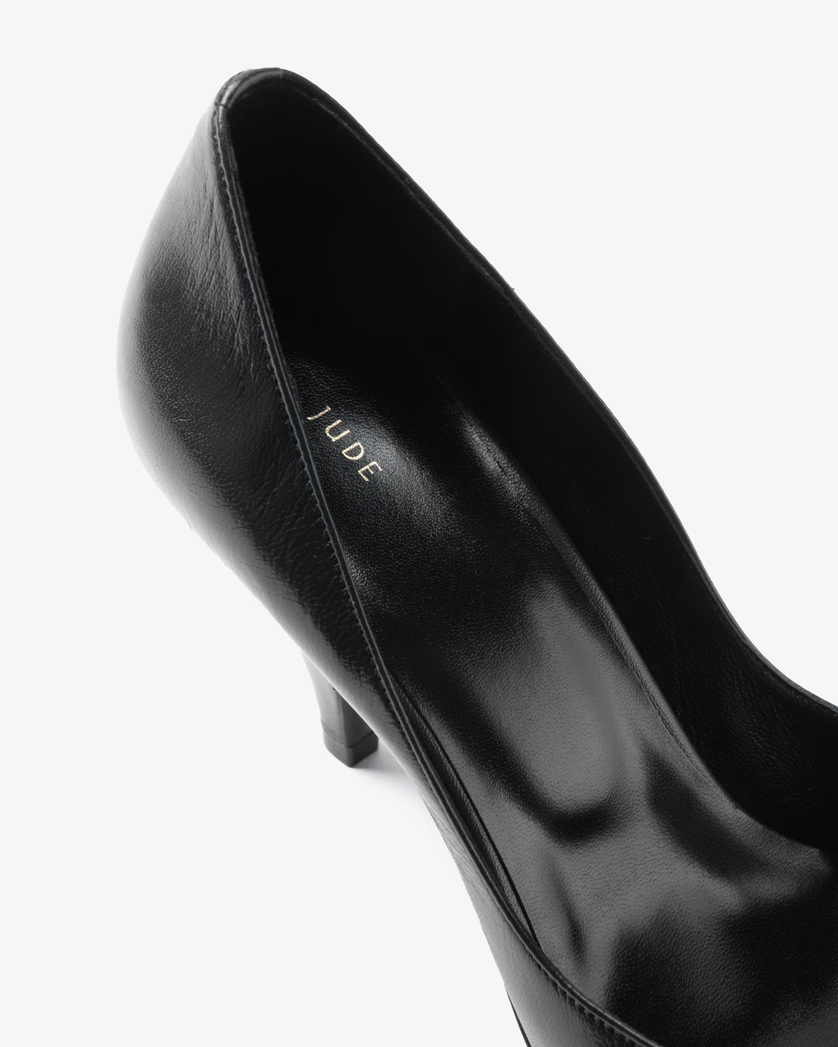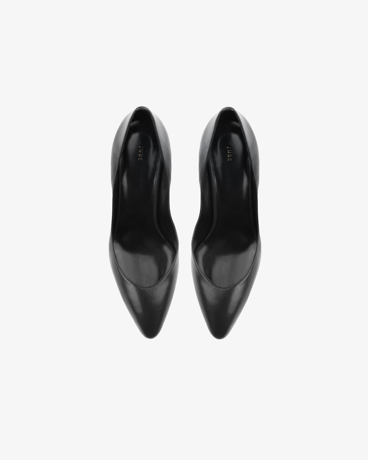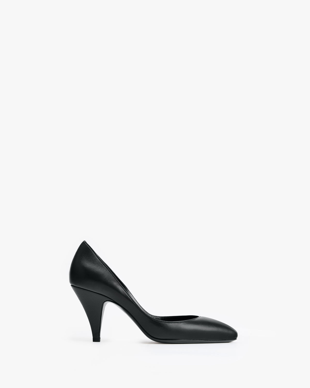 Creased leather almond toe shape pump with open upper and tapered heel.