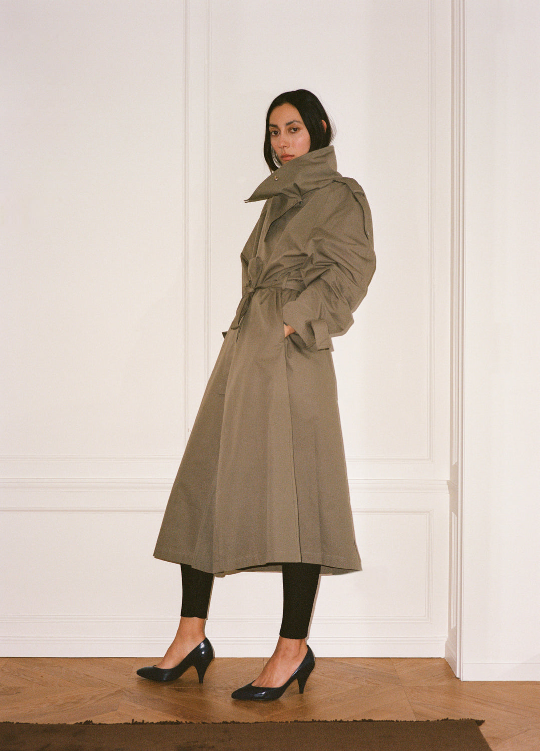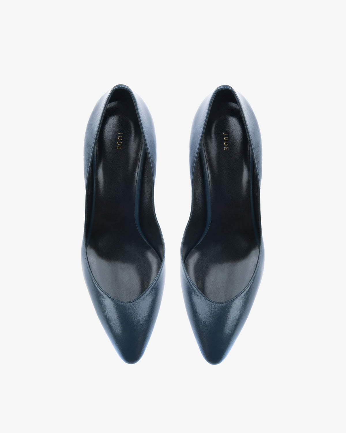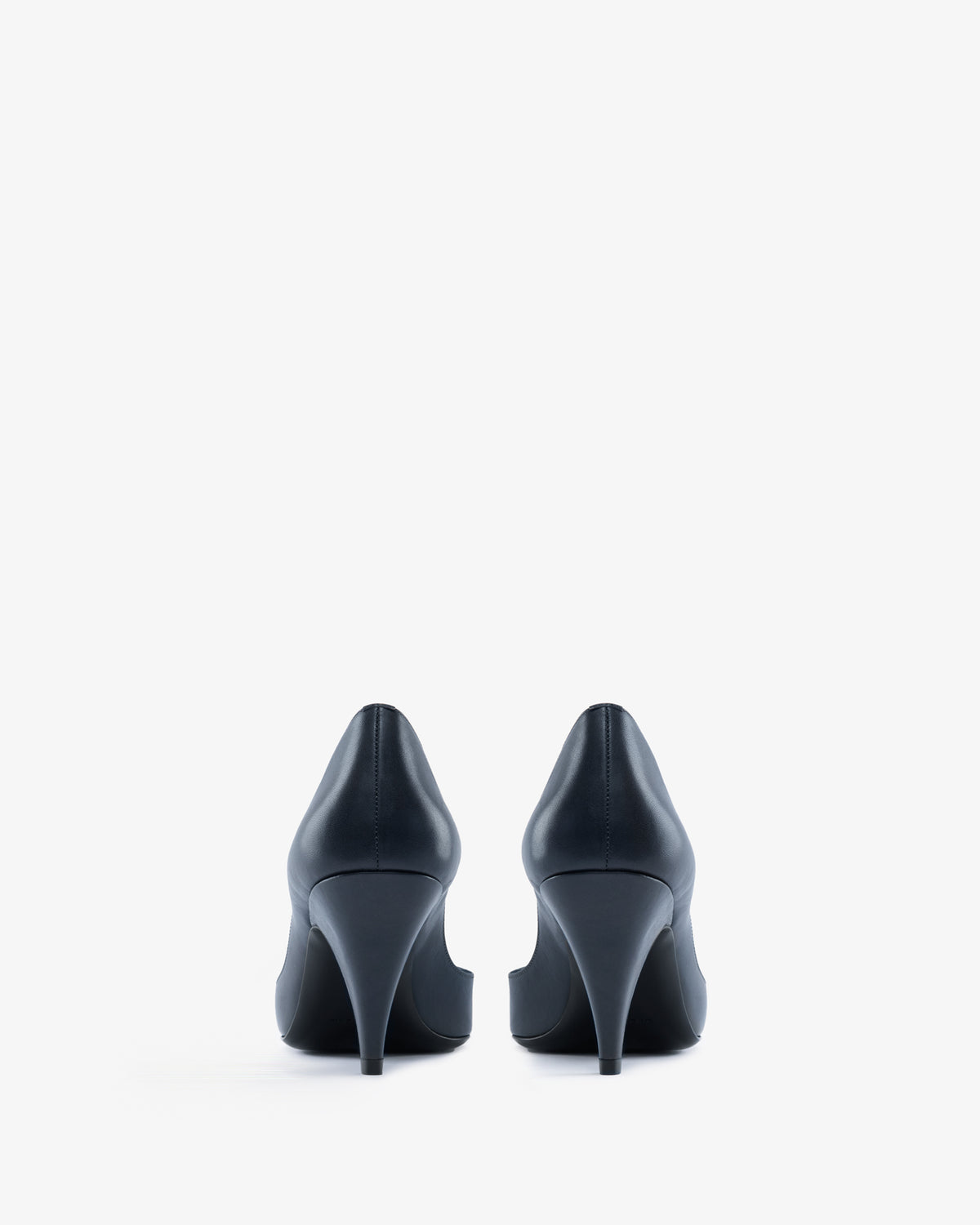 Creased leather almond toe shape pump with open upper and tapered heel.