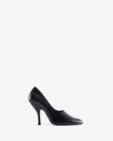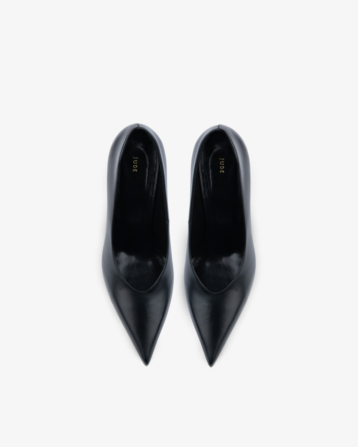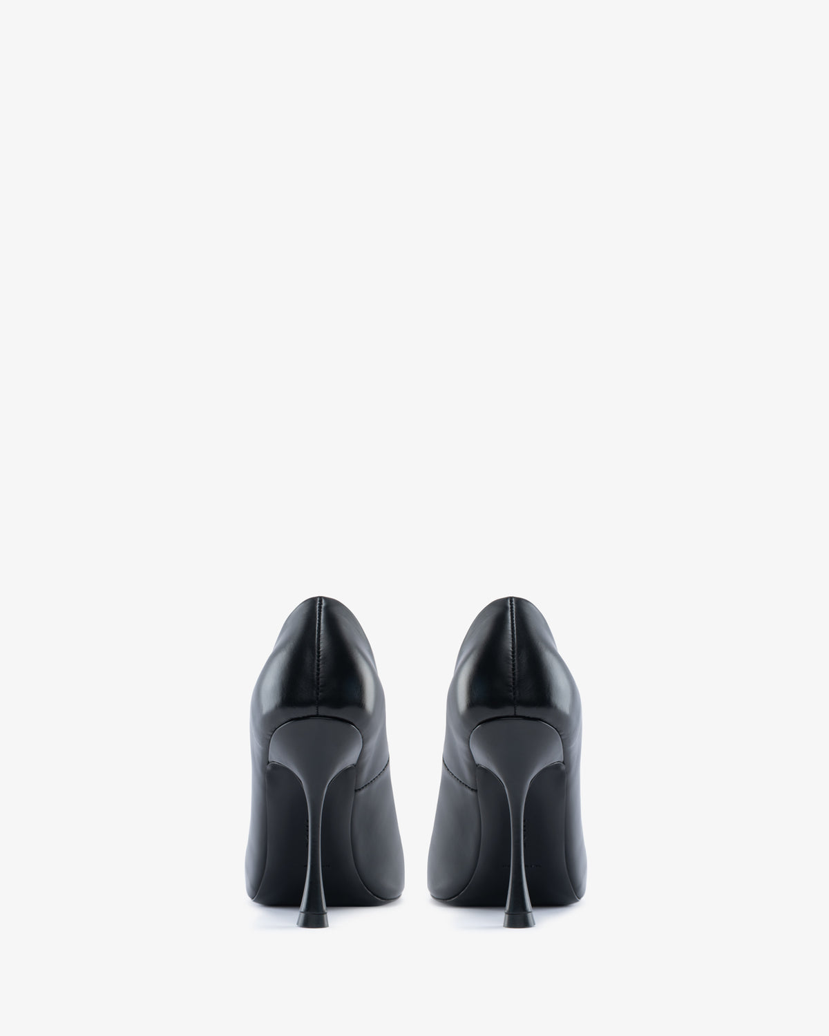 Pointed toe stiletto pump with lifted collar in polished black leather.