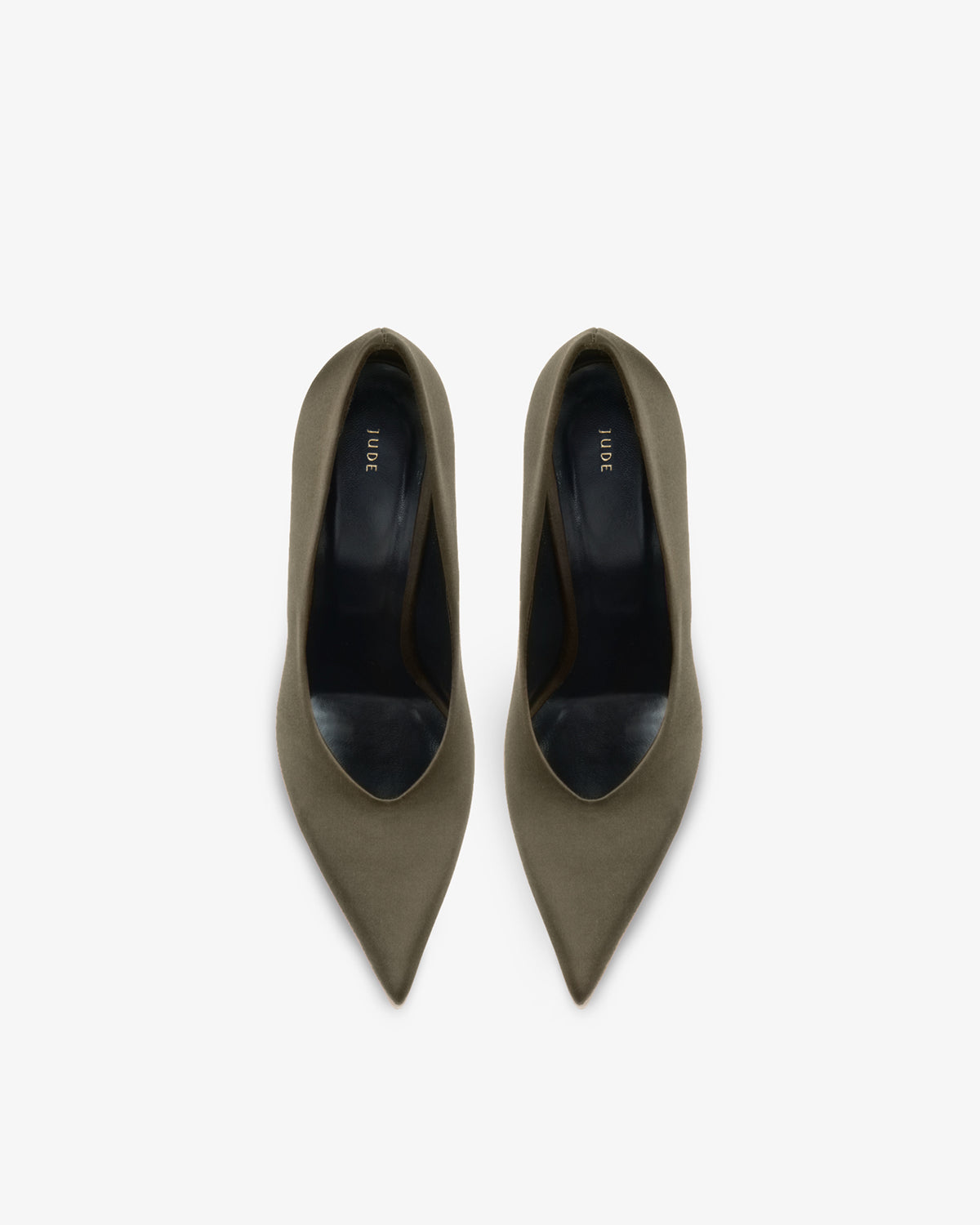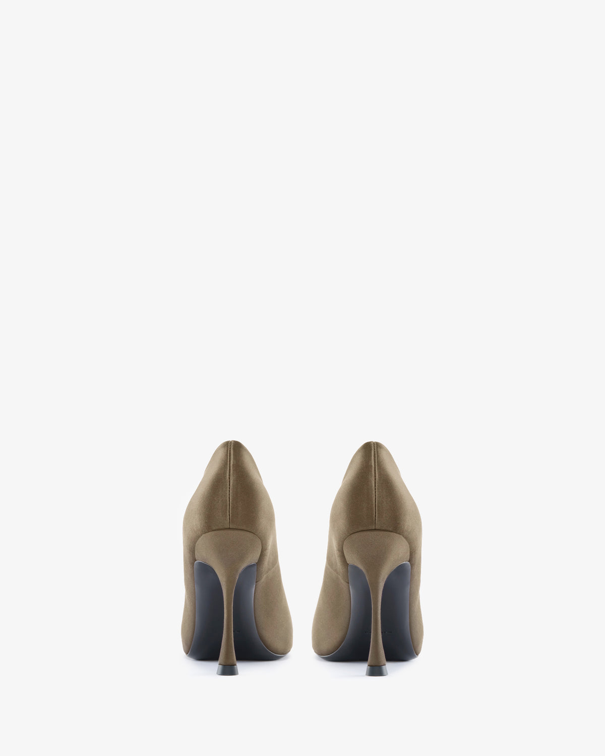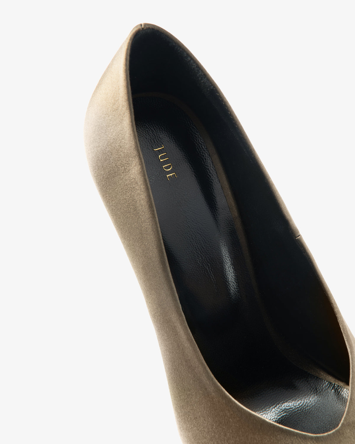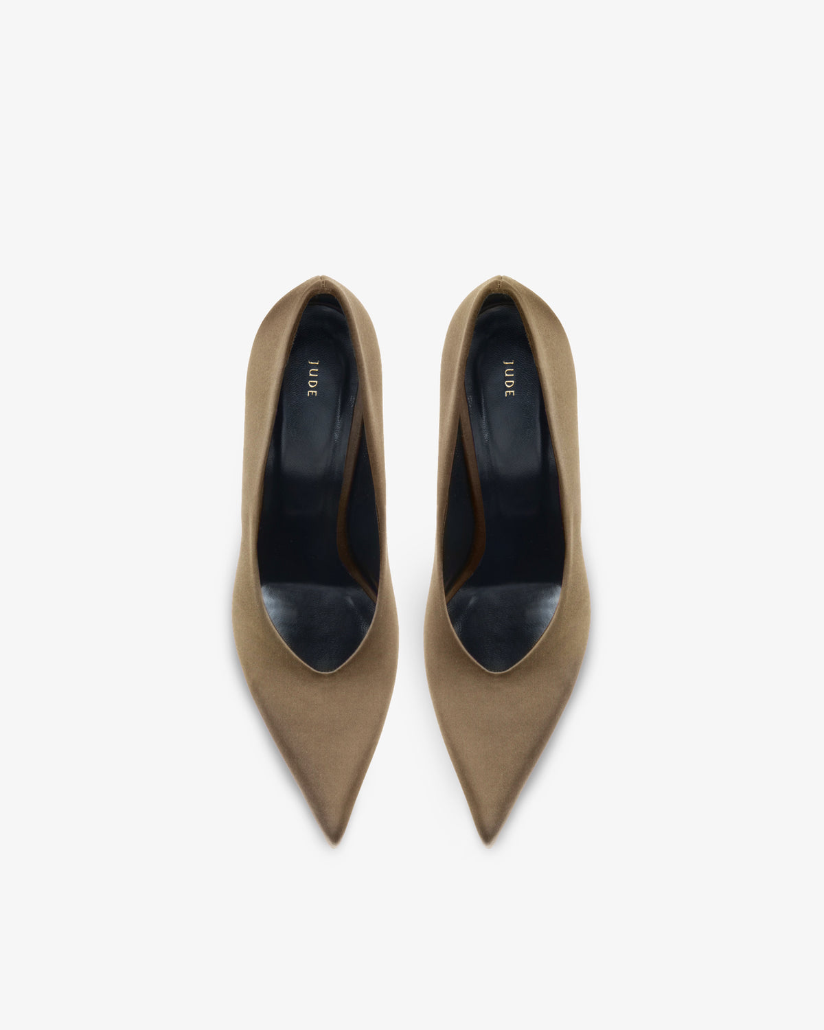Pointed toe stiletto pump with lifted collar in double Italian silk satin.