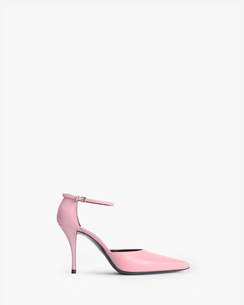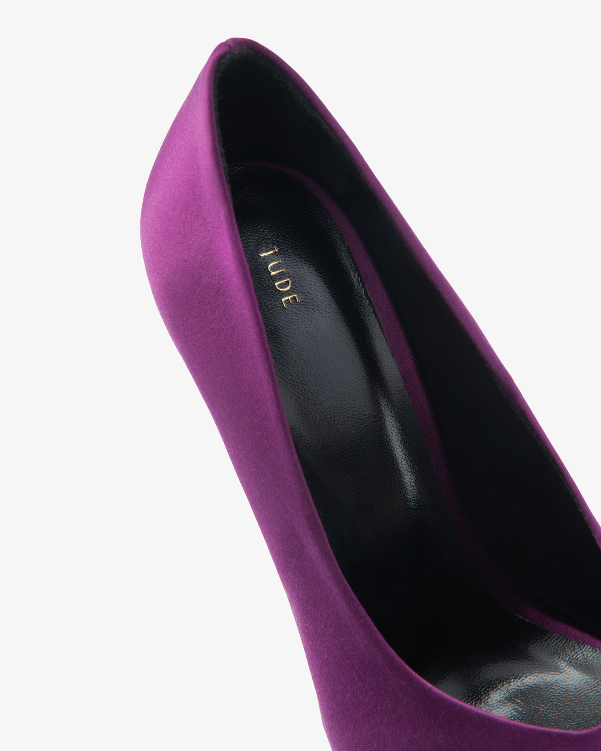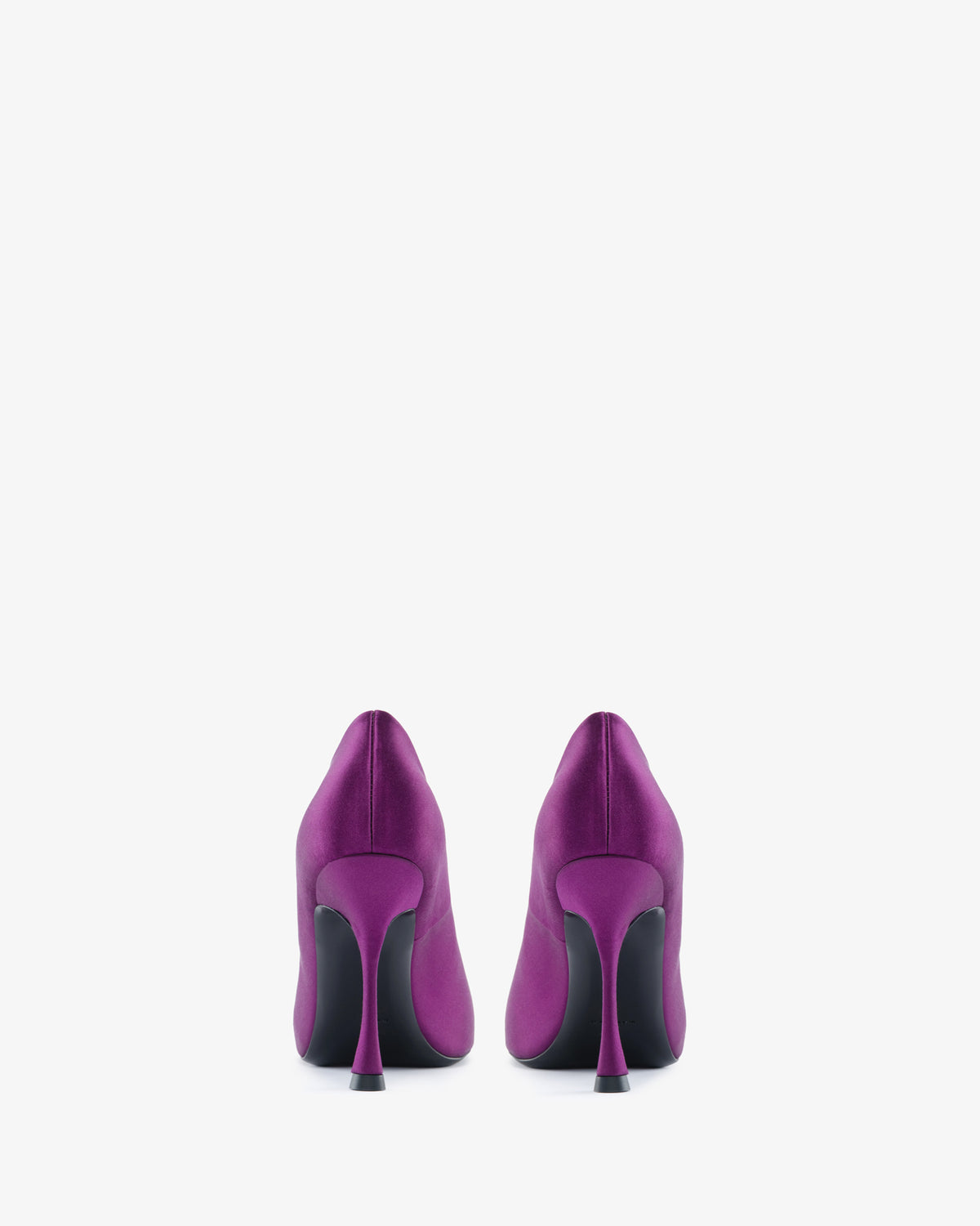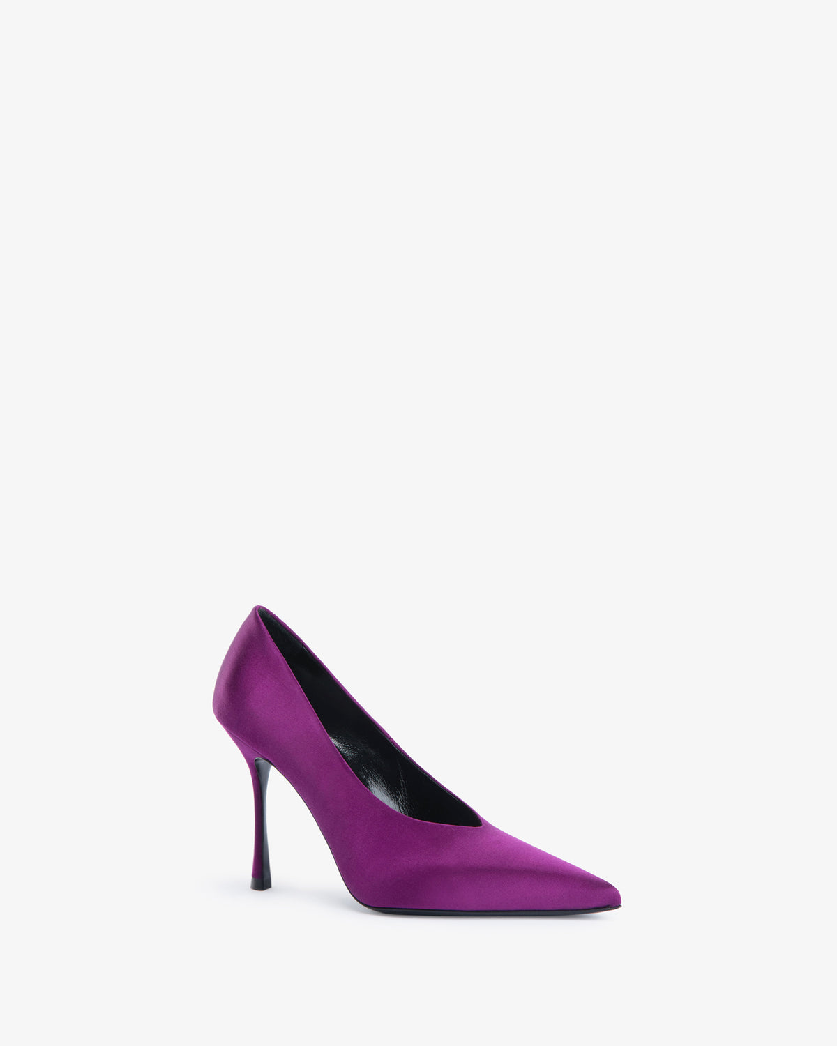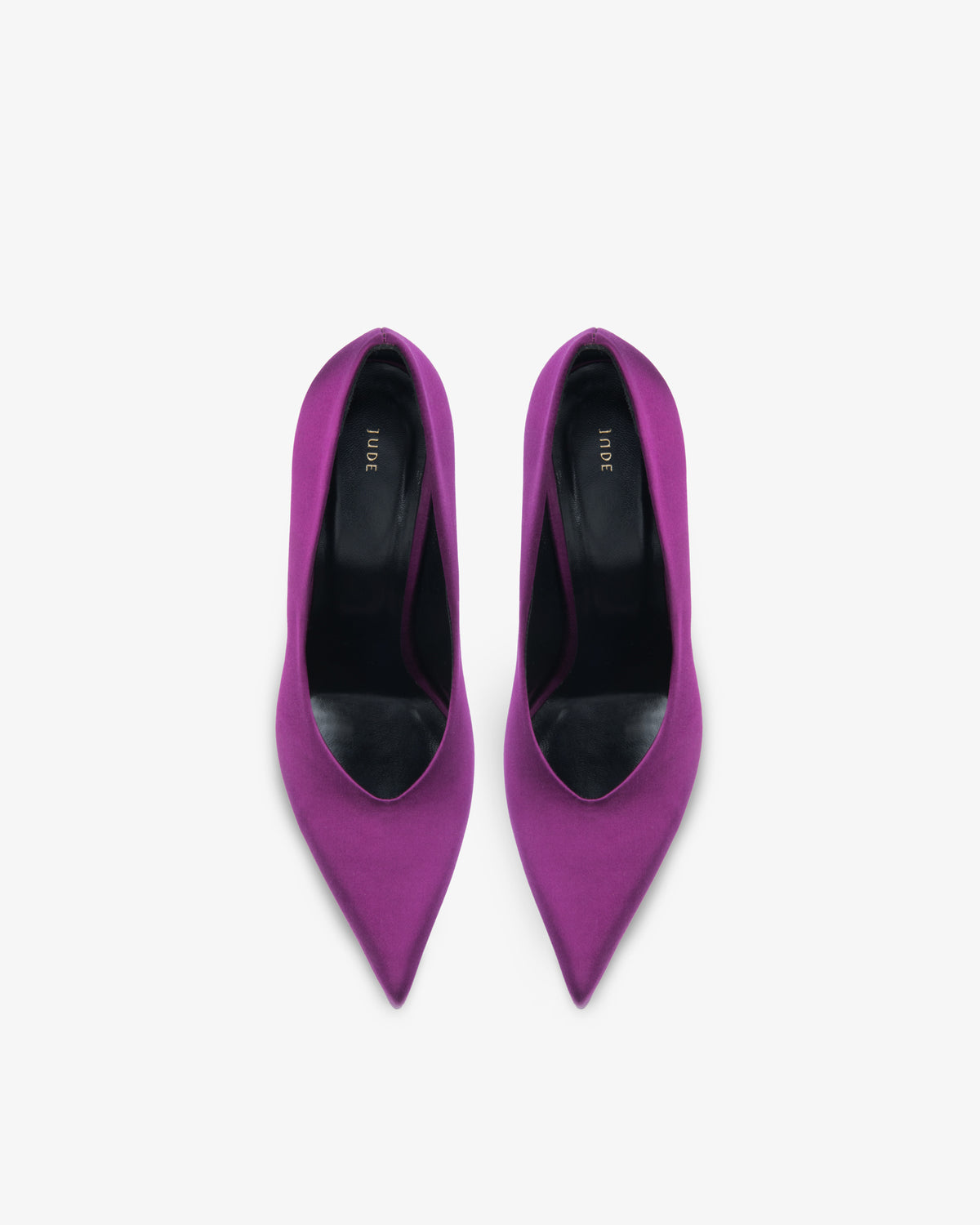 Pointed toe stiletto pump with lifted collar in double Italian silk satin.