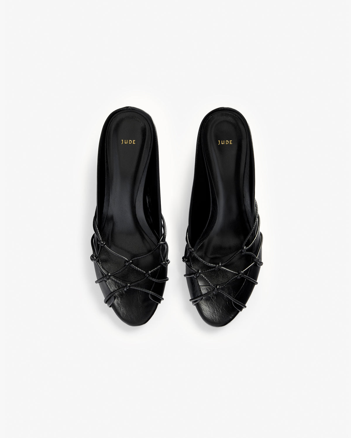 Creased leather slip on sandal with shallow upper and intricate, knotted leather strap detail.