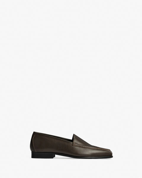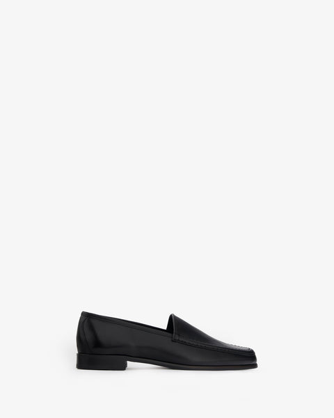 Simplified classic loafer in soft leather with hand stitched detailing and leather sole.