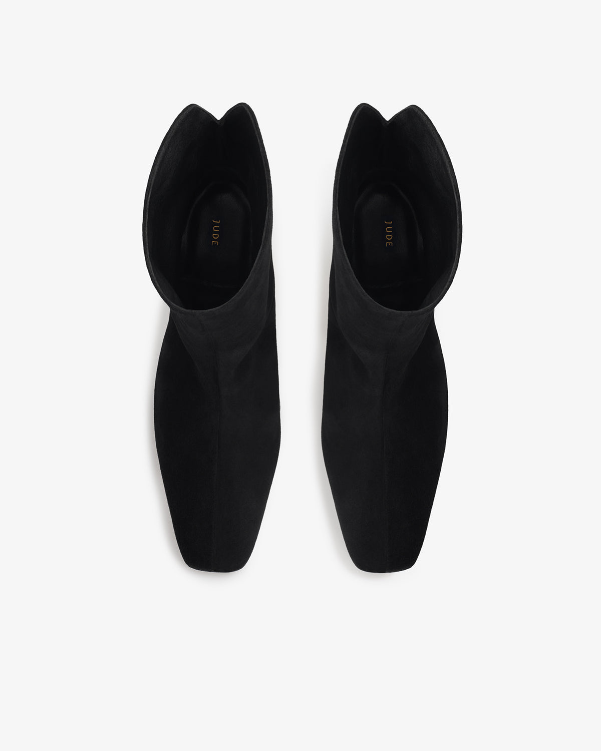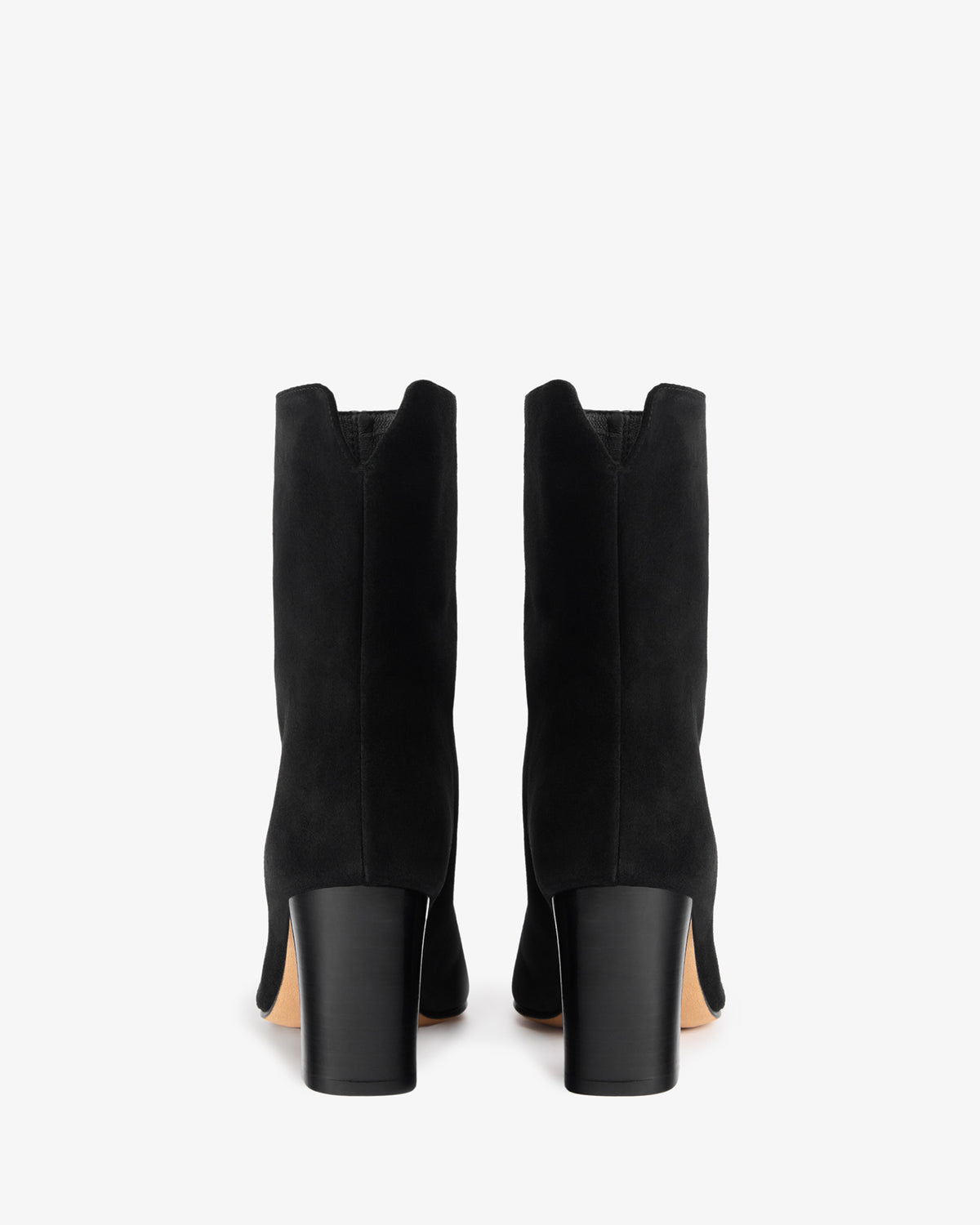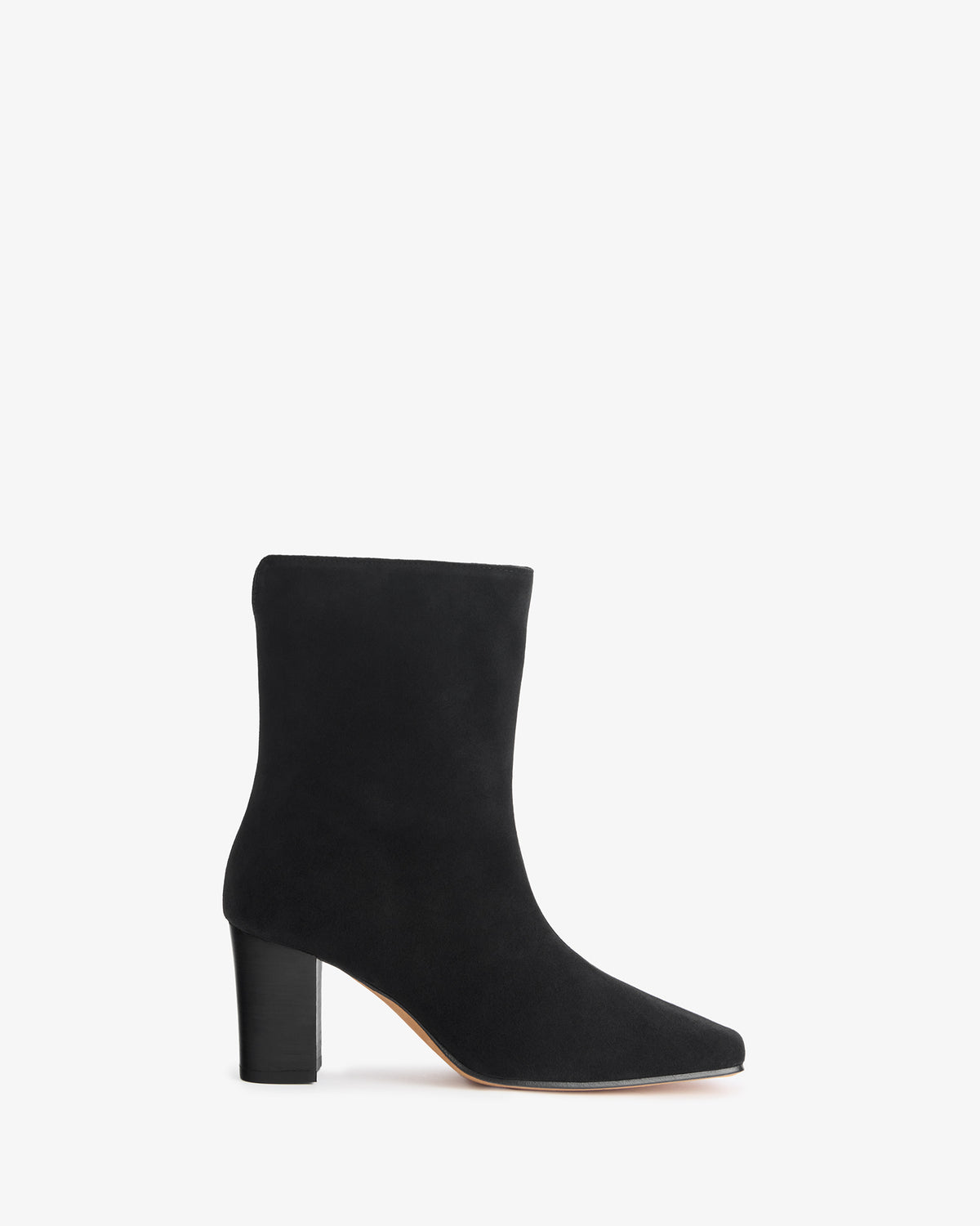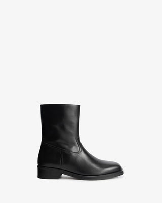 Ankle high stretch leather boot with square toe shape and block heel.