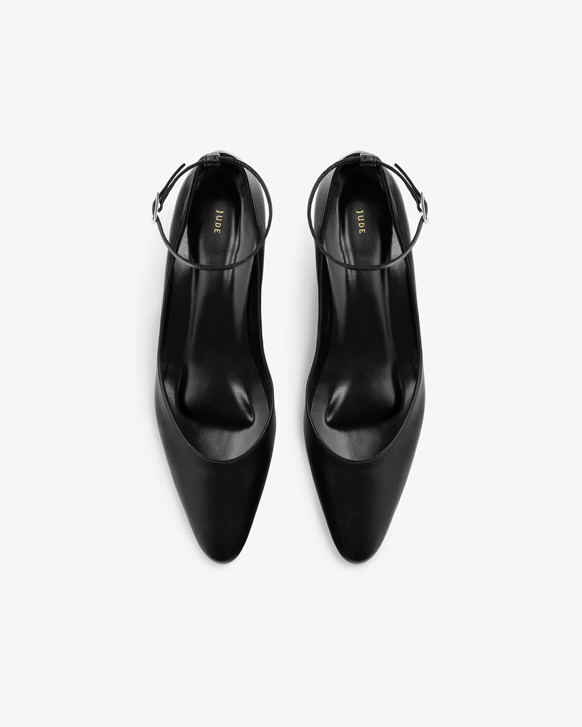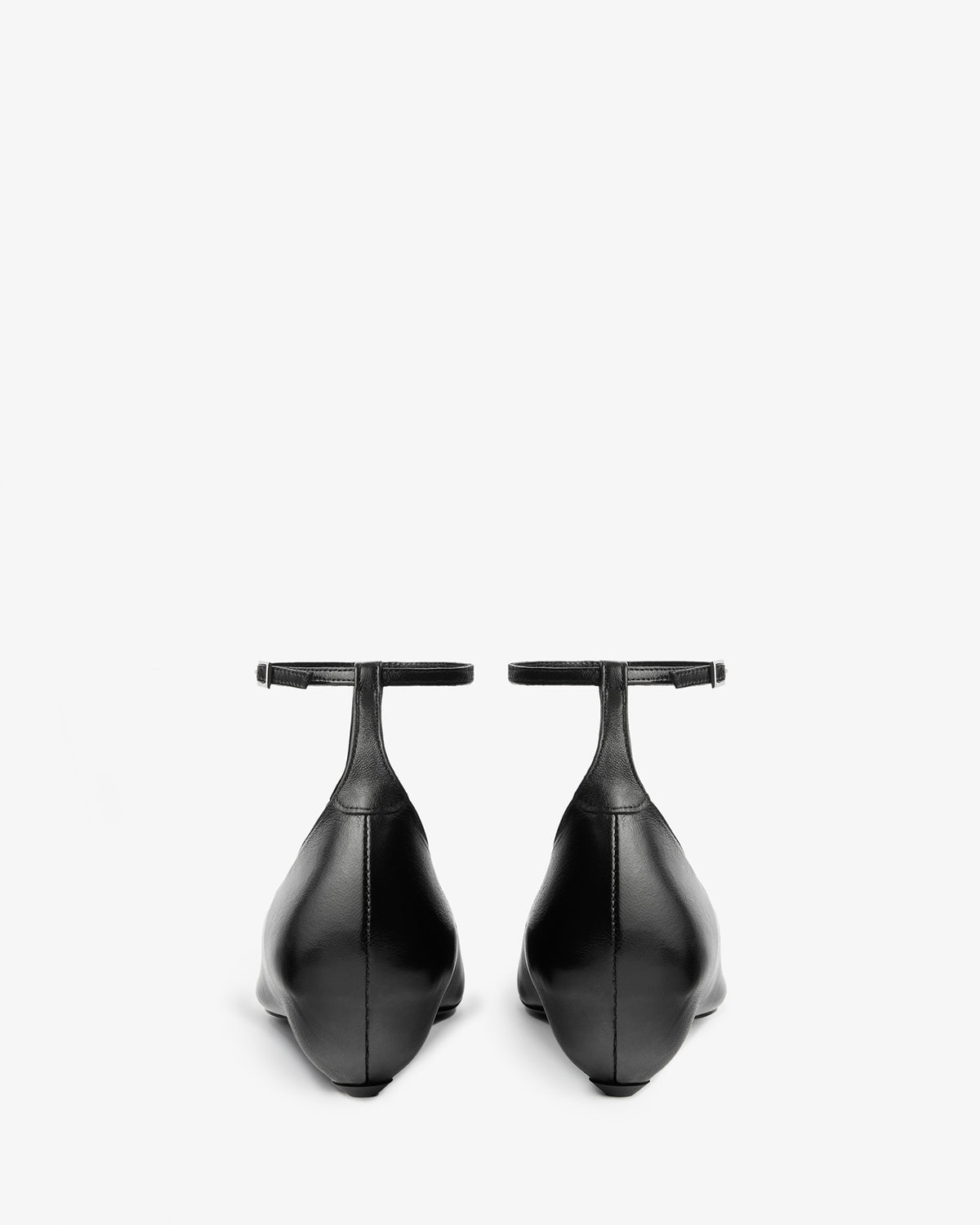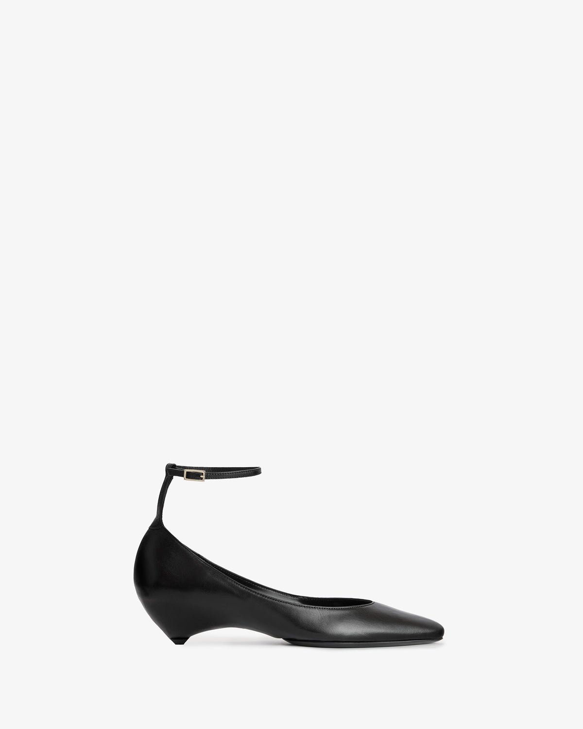 Ballerina in soft lamb leather with an almond shaped toe, adjustable buckled ankle strap, and rounded heel covered in leather.
