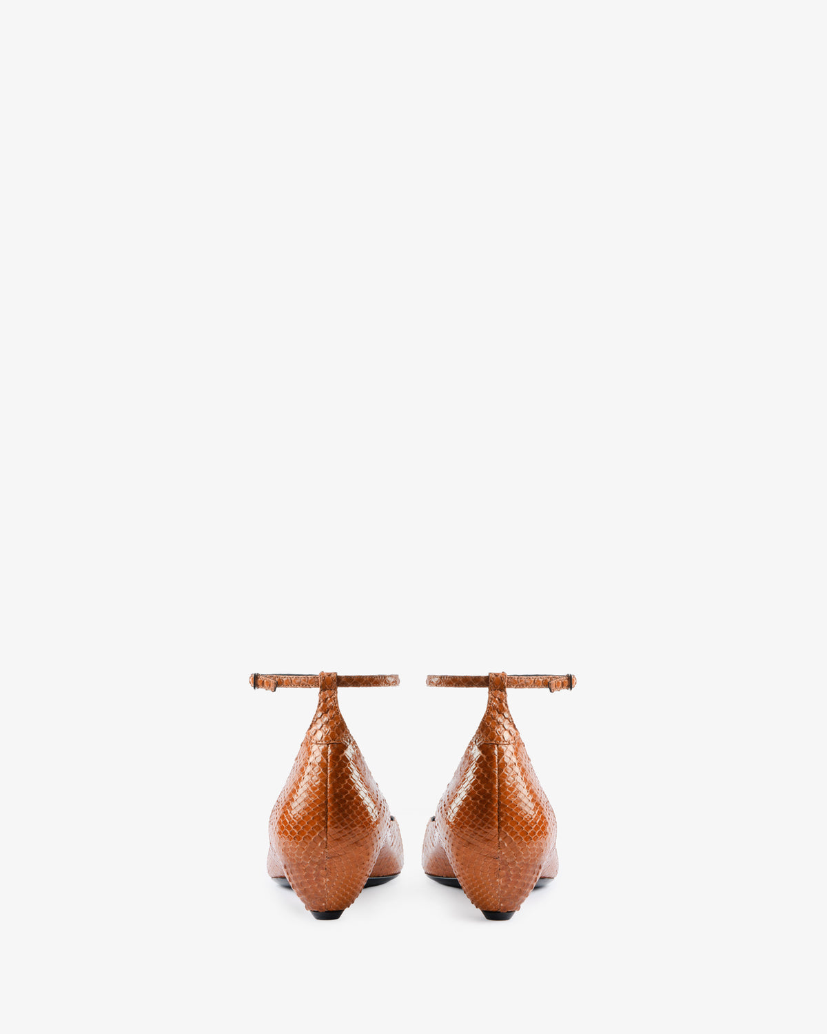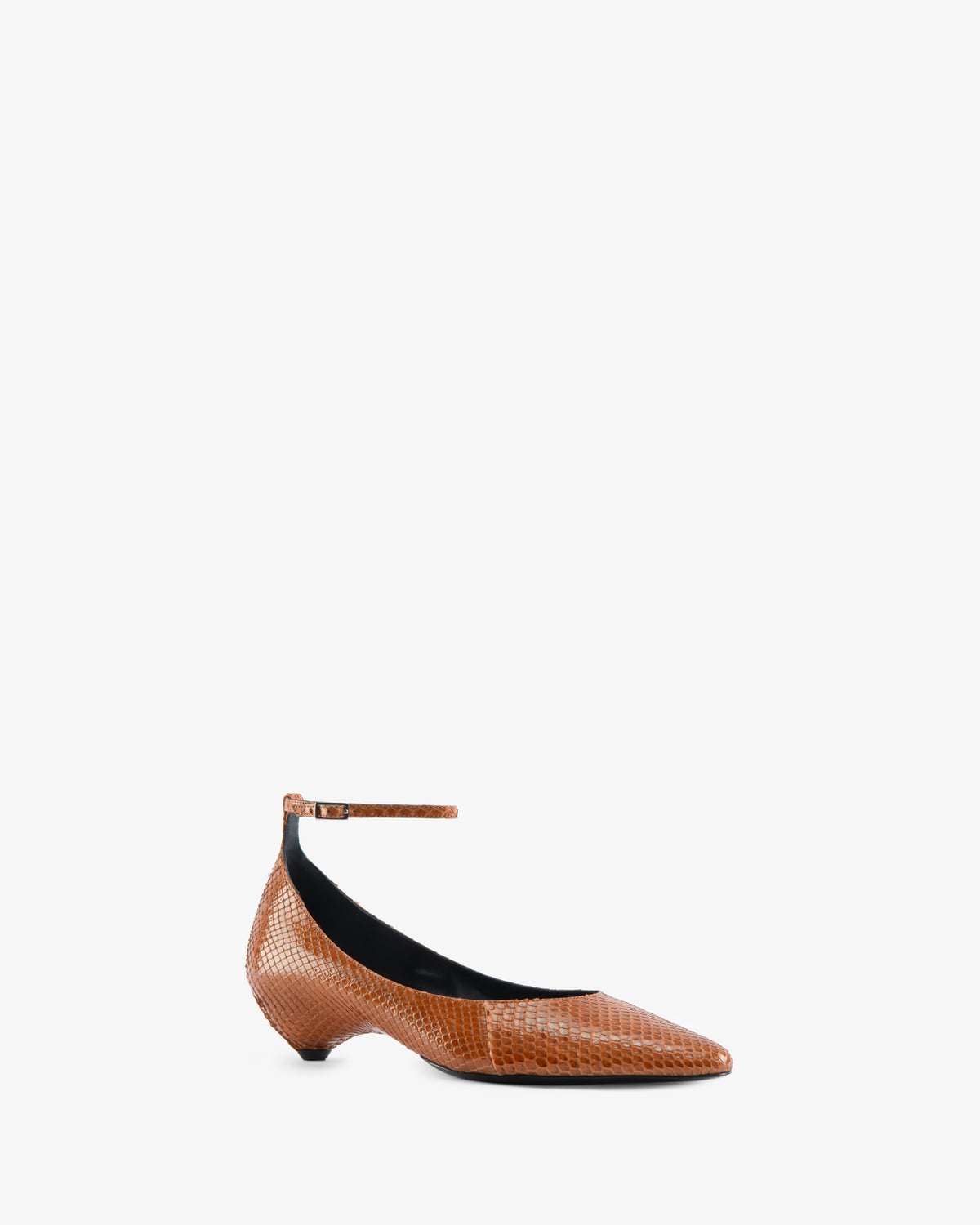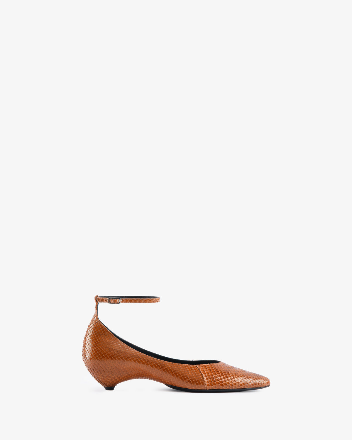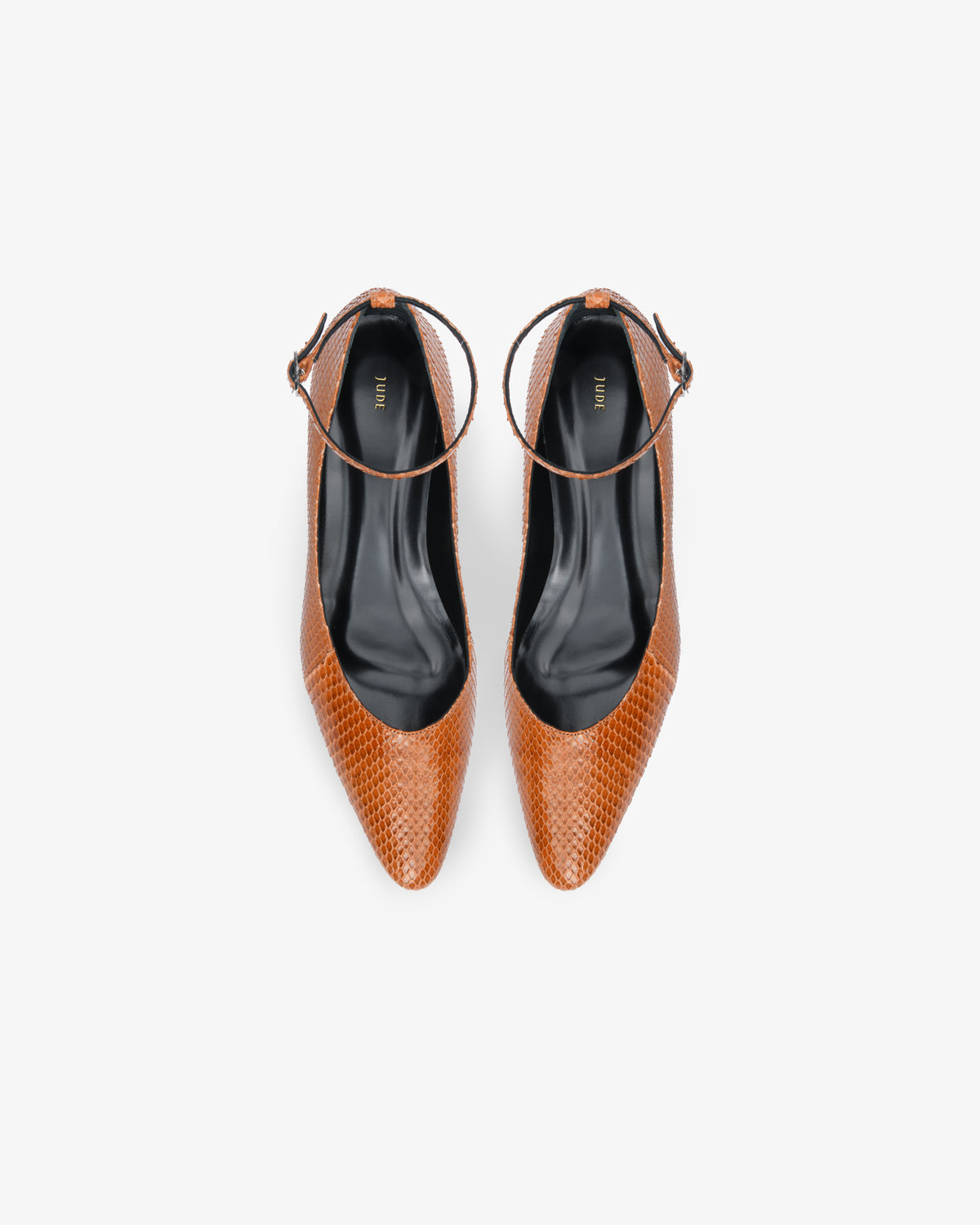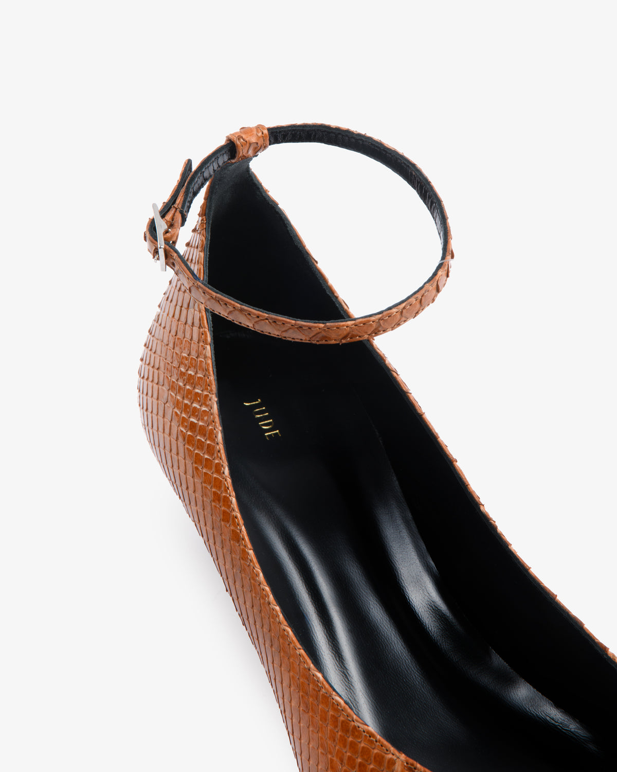 Ballerina python leather with an almond shaped toe, adjustable buckled ankle strap, and rounded heel covered in leather.