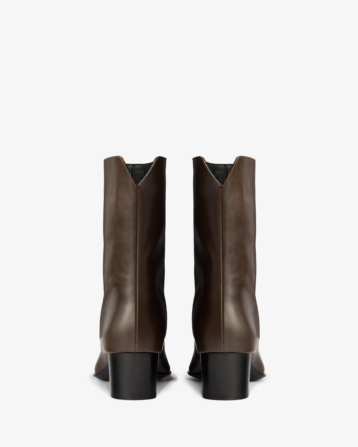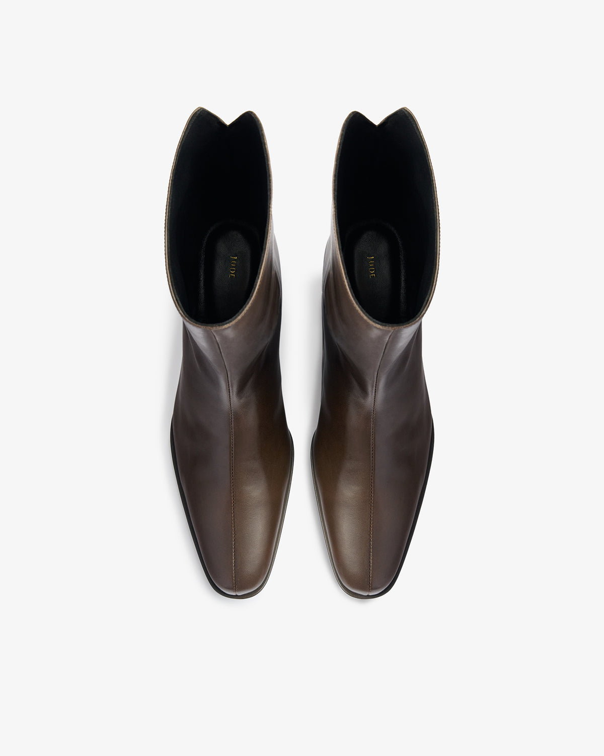 High ankle boot in polished calfskin leather with round toe and block heel.