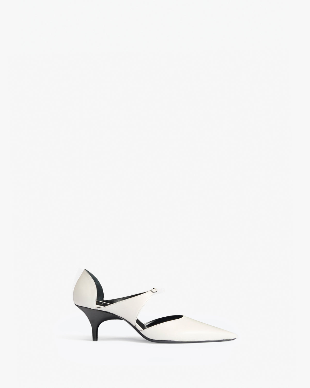 Pointed toe pump with sculpted heel and geometric cutout upper.