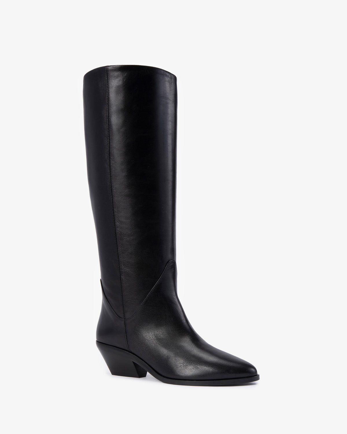 Knee high boot in soft calfskin leather with round toe, wide shaft and pyramid heel.