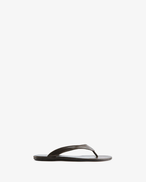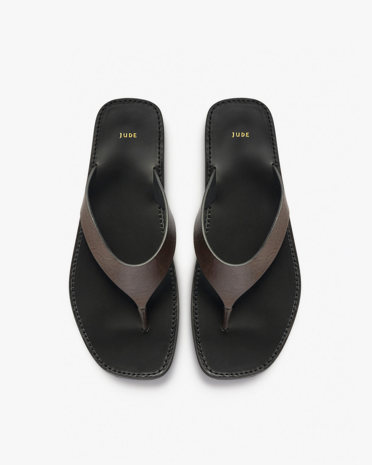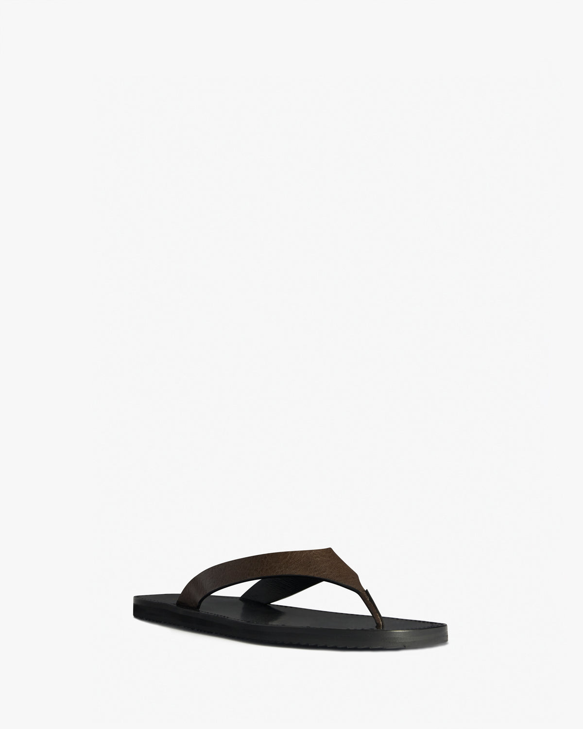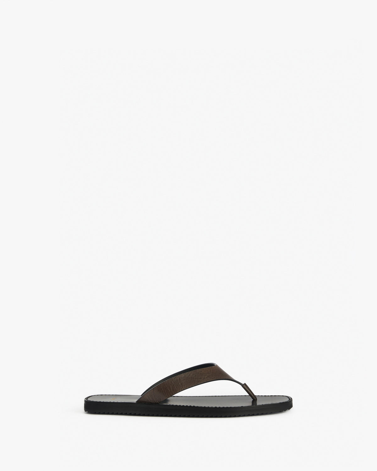 Flat thong sandal with laser cut and painted edge upper and chunky leather sole.